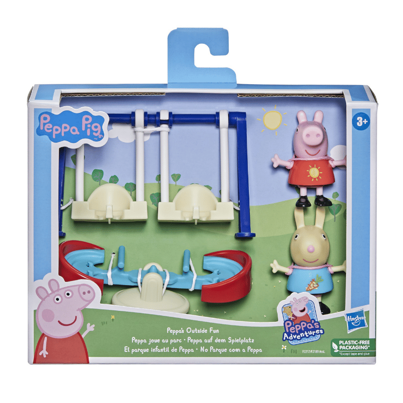 Pakkaus sisältää 7,5 cm Pipsa Possu ja Rebecca Kani -hahmot, keinun ja kiipeilytelineen.