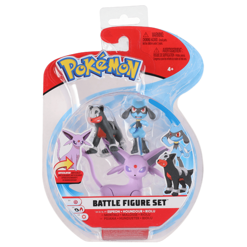 Valmistaudu taisteluun kahdella 5 cm ja yhdellä nivelletyllä 8 cm Pokemon hahmolla. Pakkauksessa on kolme pokemonia, Espeon, Houndour ja Riolu. Kerää kaikki suosikki Pokemonisi!