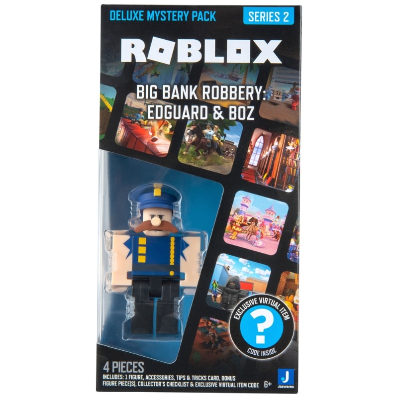 Mysteeri pakkauksessa on viisi osaa: Roblox-hahmo, lisätarvikkeita, tippiraha, temppukortti, ylimääräisiä hahmon osia, tehtävälista ja sekä koodi, jolla saat virtuaaliesineen Roblox-pelissä. Hahmolla on liikkuvia raajoja.