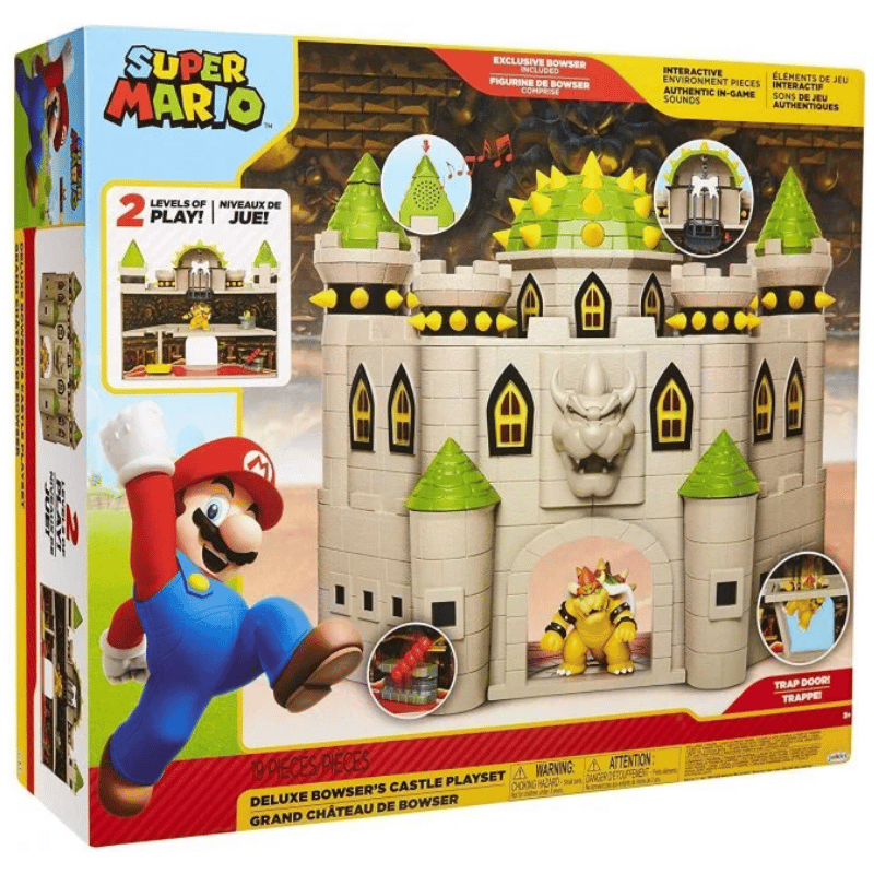 Super Mario Deluxe Bowser Castle -leikkisetti on täynnä ansoja ja vaaroja, pystytkö sinä selviämään kaikista haasteista? Linnan kahden kerroksen väillä kuljetaan toimivalla hissillä, mutta varo pyörivää tulipalloa, häkin alla olevaa salaluukkua ja tietenkin itse pahaa Browseriä.