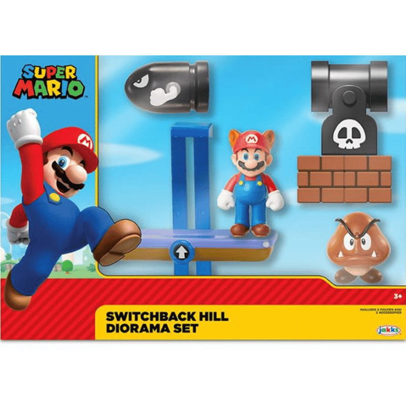 Switchback Hill Diorama -setin avulla voit nauttia tästä hauskasta ympäristöstä, joka on saanut inspiraationsa Super Mario™ -videopeleistä. Lapset voivat laajentaa Mario World -maailmaansa hahmoilla ja ainutlaatuisilla lisävarusteilla, joissa on ominaisuusmekanismeja.