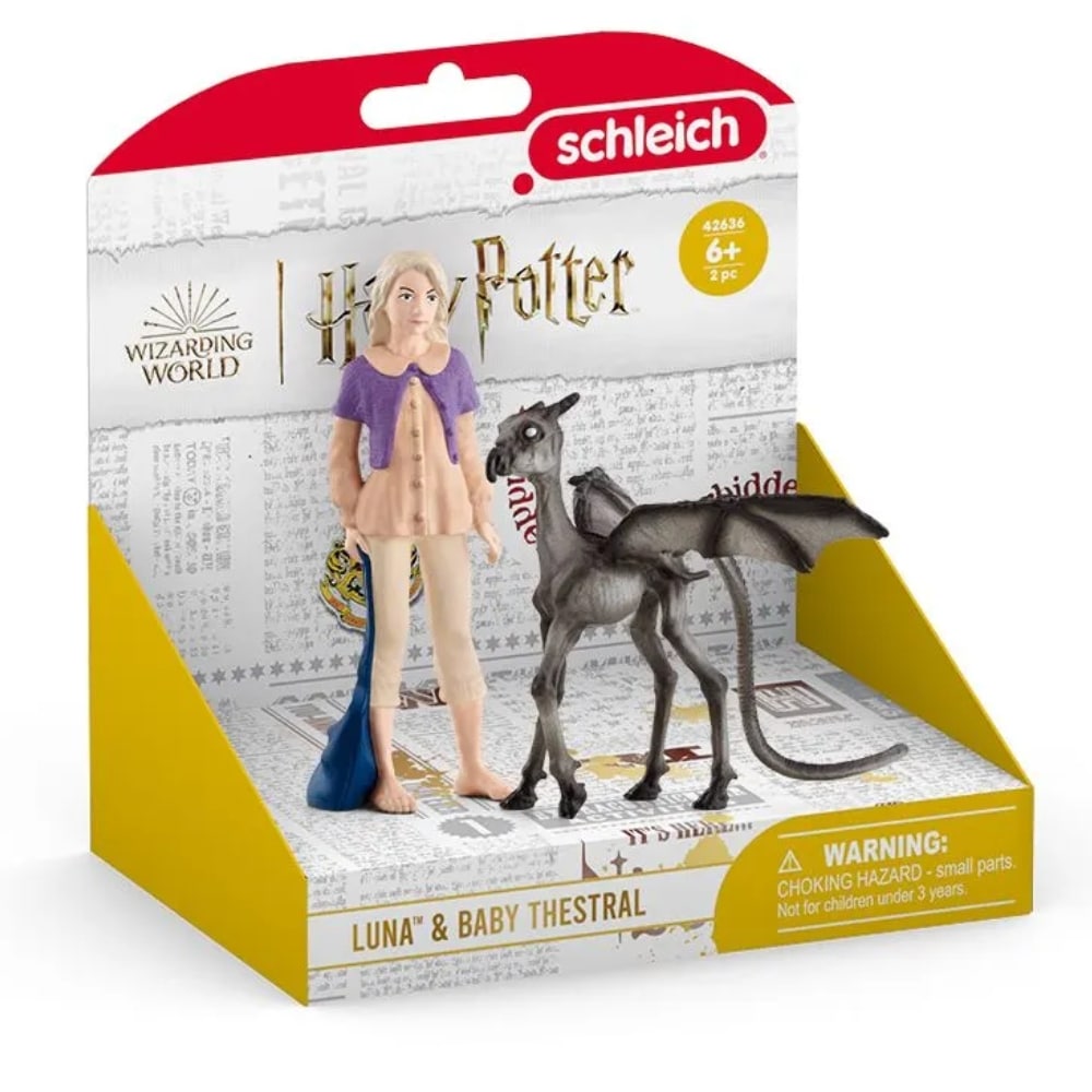 Schleich Luna & Baby Thestral 42636 – Luna Lovekivalla on paljaat jalat, pitkät vaaleat hiukset, violetti liivi ja sininen laukku. Hänen vierellään seisoo pieni thestral siivet levitettyinä.