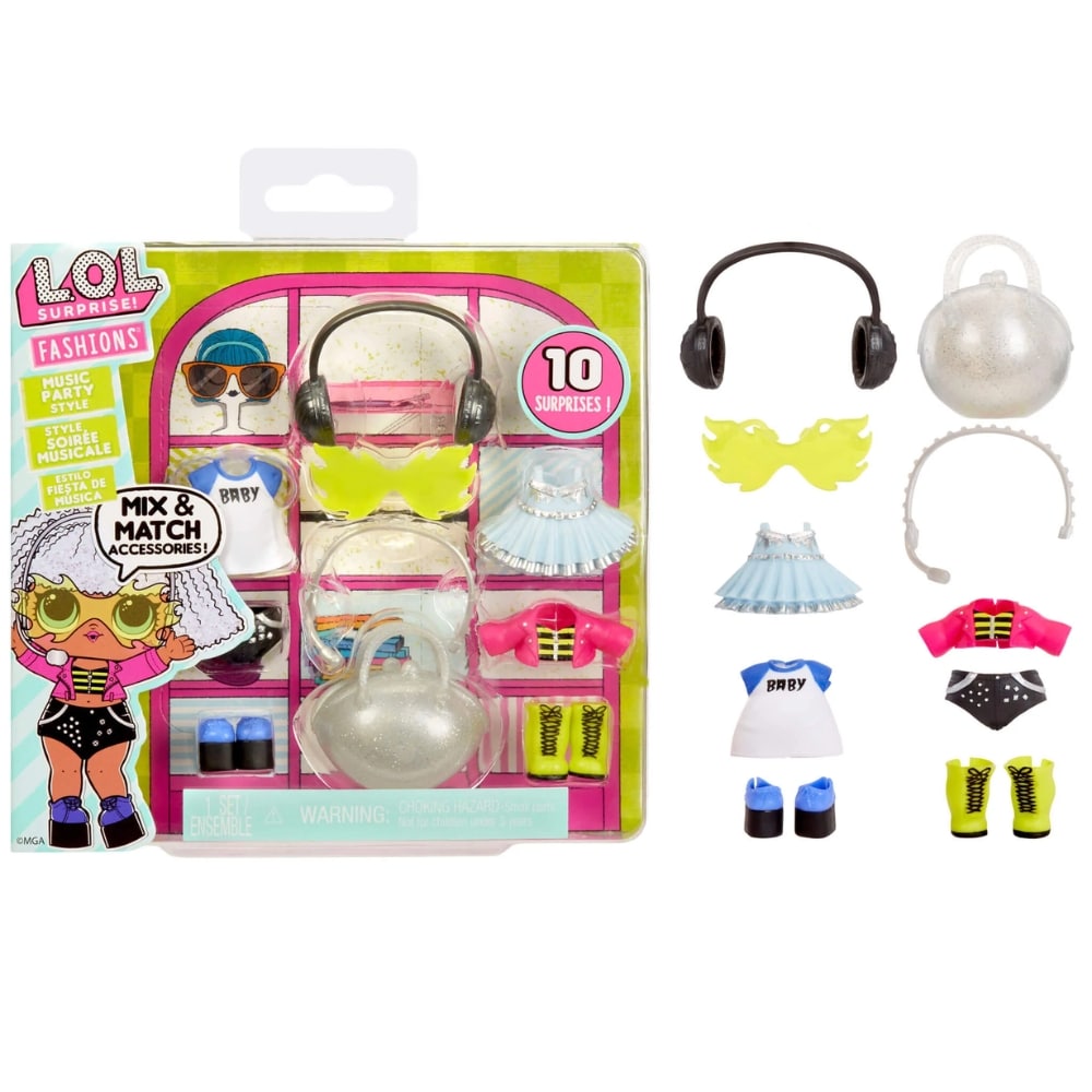 L.O.L. Surprise Fashions Music Party Style sisältää 10 yllätystä! Tule muodikkaaksi LOL Surprise Fashion Pack-asutyylillä. Aloita pukujuhlasi muotiasusteilla, jotka sopivat tunnelmaasi, ja laajenna sitten kokoelmaasi entistä useammalla muotipaketilla.