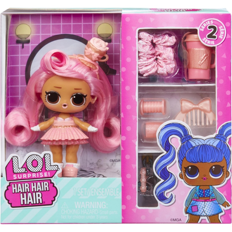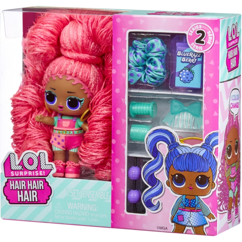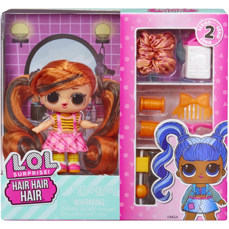 L.O.L. Surprise Hair Hair Hair Doll sarjasta kaksi olevat muotinuket ovat nyt täällä! Lajitelmassa on kahdeksan erilaista nukkea. Jokaisella on upea tyyli ja pitkät näyttävät hiukset ja kampaus. Pakkausten mukana tulee 10 yllätystä: muotinukke, upea asu, kengät, hiusdonitsi ja muita hiuskoruja sekä juomapullo. Kerää kaikki kahdeksan nukkea!