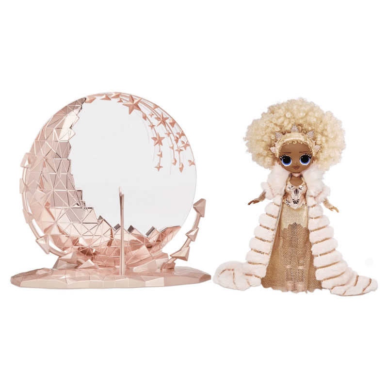 L.O.L. OMG Collector nukke 2021 NYE Queen Collectors-muotinukke kultaisessa asussa, upeilla asusteilla ja valaistulla nukketelineellä. Juhli tyylillä uuden vuoden juhlaa! NYE Queenin upea asukokonaisuus on juhlien keskipiste, ja tyylin kruunaa kultainen tiara sekä kauniit, muotoillut hiukset. NYE Queen on upean yksityiskohtaisella, valaistulla lavalla, jolla voi esittää mahtavan ohjelmanumeron juhlissa.