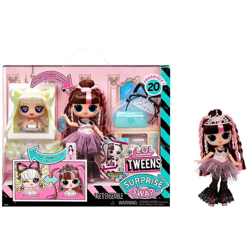 - Yhdistä Tweens Surprise Swap -nuket uusiin silmiinpistävään Surprise Swap -muotoilupäihin, joissa jokaisessa on upeat hiukset ja hiustarvikkeet, jotta niitä voidaan muokata entistä enemmän! Jokaisella nukella on upeat piirteet, kauniit hiukset, oma lumoava tyylinsä, ja ne on muotoiltu lukuisiin poseerausmahdollisuuksiin. Tarvikkeet voidaan säilyttää siististi ihastuttavassa kotelossa, ja ylimääräinen muotoilupää voidaan aina asettaa takaisin päätelineeseen, kun se ei ole käytössä, jotta se on helpompi puhdistaa.
