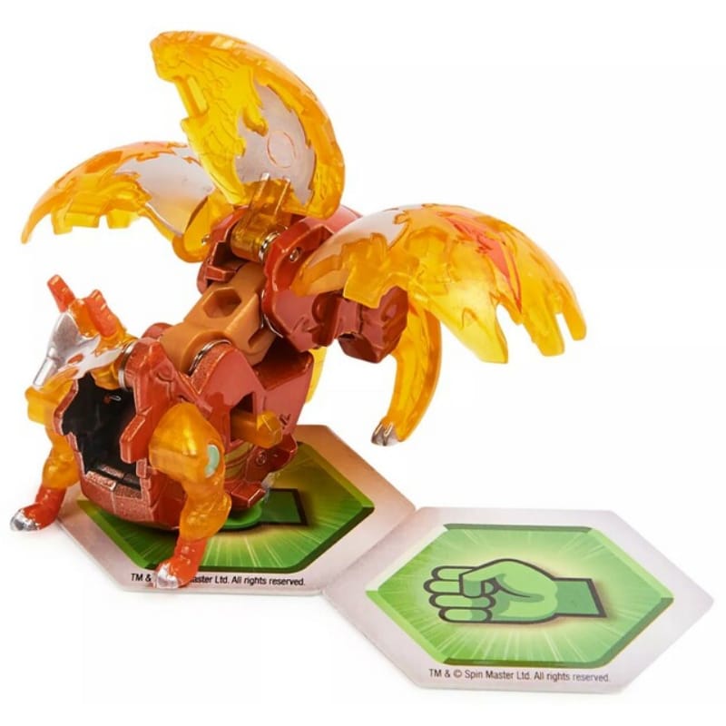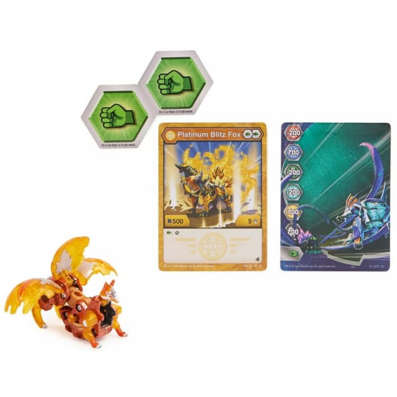 - Pakkaus sisältää: yhden osittain metallisen Bakuganin, kaksi BakuCorea, porttikortin ja persoonallisuuskortin.