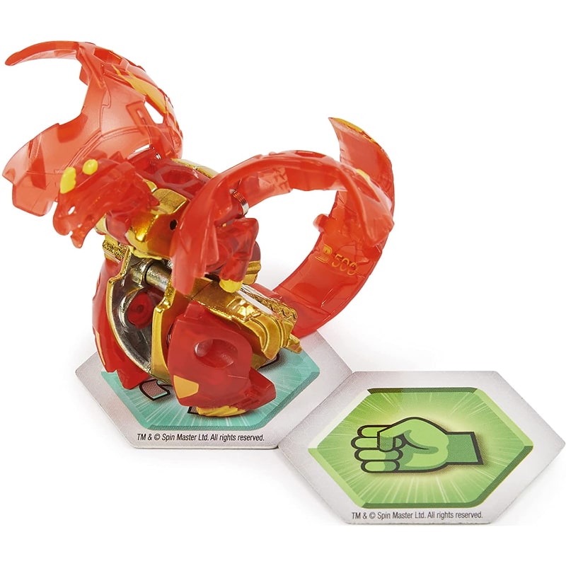 - Pakkaus sisältää: yhden osittain metallisen Bakuganin, kaksi BakuCorea, porttikortin ja persoonallisuuskortin.