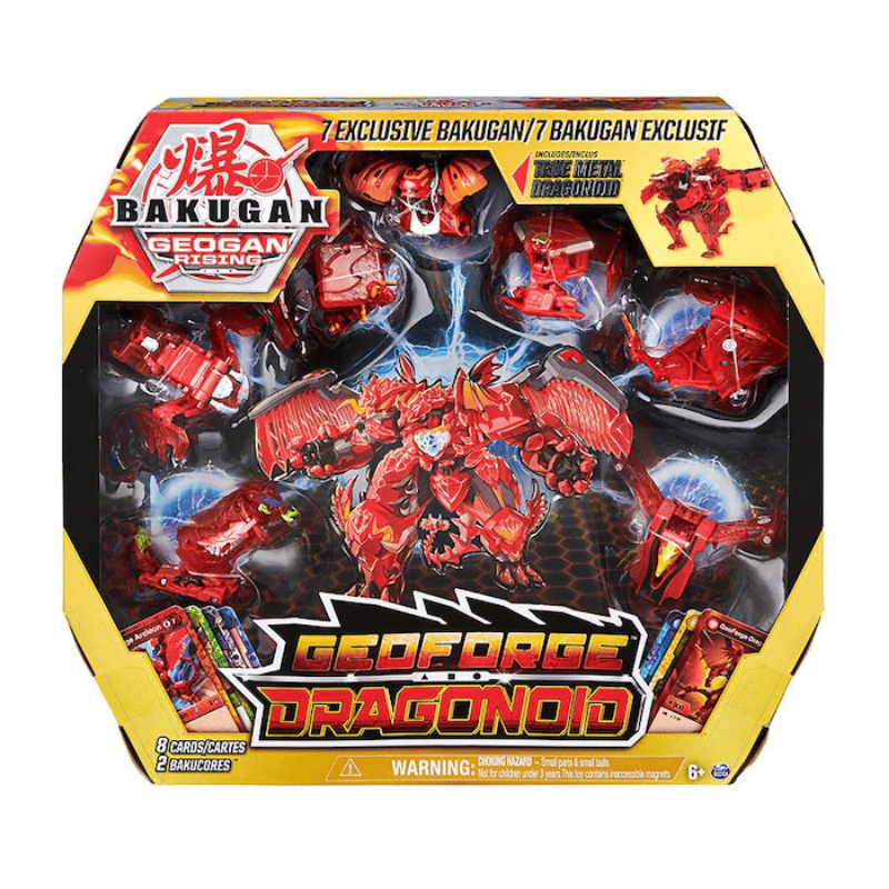 GeoForge Dragonoid -leikkisetti sisältää kuusi ainutlaatuista Geogania, yhden ainutlaatuisen metallisen True Metal Dragonoidin, kahdeksan korttia (kuusi kykykorttia, merkkikortin ja portaalikortin) ja kaksi BakuCoresia. Valmistaudu eeppiseen muutokseen yhdistämällä Geoganit ja saat rakennettua ainutlaatuisen GeoForge Dragonoidin! Kilpaile ystäviäsi vastaan seitsemällä ainutlaatuisella hahmolla. Mukana Dragonoid, Titan King, Stingzer, Talan, Montrapod, Arachnia ja Arcleon. Pudota Geogan ja katso, miten se muuttuu rajuksi hahmoksi! Yhdistämällä hahmot mahtavaksi GeoForge Dragonoidiksi, olet vahvempi kuin koskaan ennen! Aloita jännittävät taistelut ja selvitä, kuka lähtee areenalta voittajana.