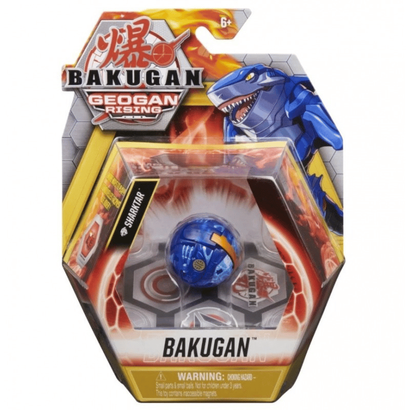 Bakugan Geogan Rising Sharktar hahmo. Pakkauksessa on 1 bakugan, 2 bakucorea, 1 hahmokortti ja 1 portaalikortti.
