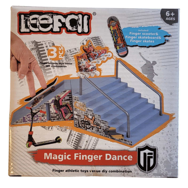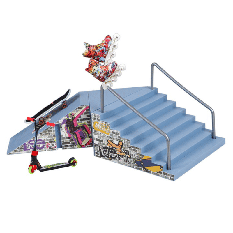 Päivitä skeittitaitosi uudelle tasolle tämän rampin avulla! Rampissa voit temppuilla kuin ammattilainen ja harjoitella sorminäppäryyttäsi eri lajeissa. Pakkaus sisältää rampin, jossa toisella puolella on portaat ja kaide, potkulaudan, rullalaudan, rullaluistimet ja liukumista estävän maton. Mukana tulee myös tarroja tuunausta varten.
