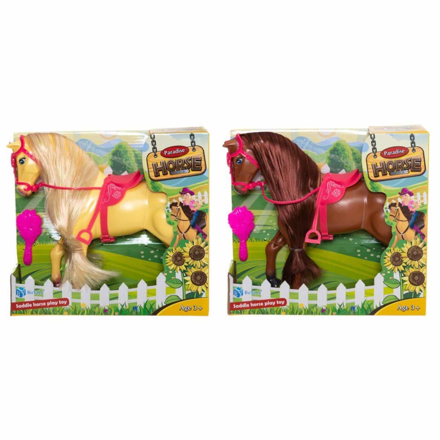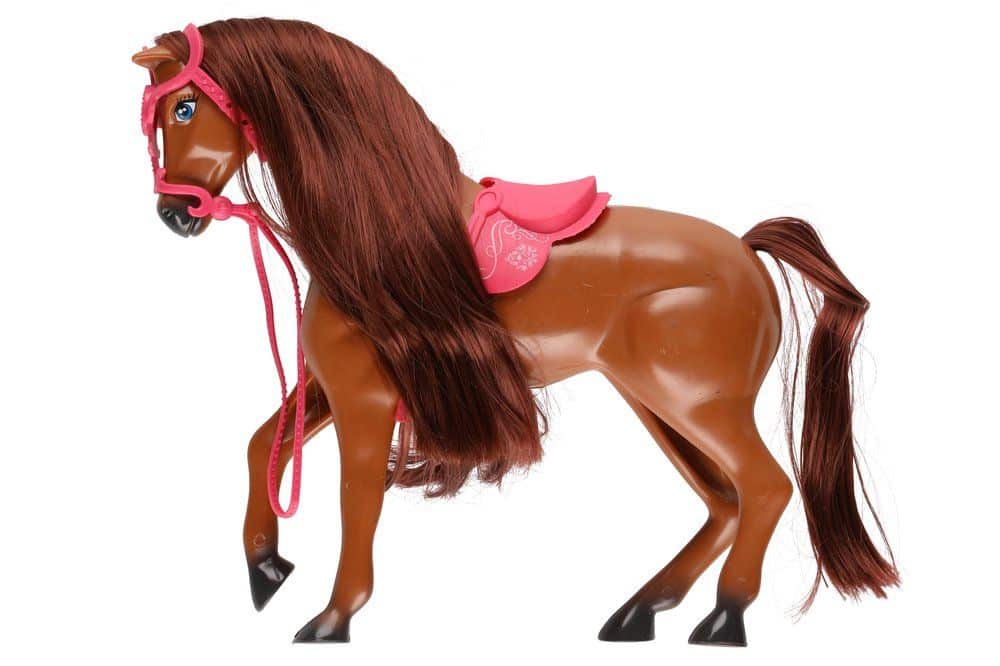 Lumoava leikkihevonen upean pitkällä harjaksella. Hevosen suitset ja satula ovat irrotettavia ja mukana tulee harja upean harjaksen huoltamista varten.
