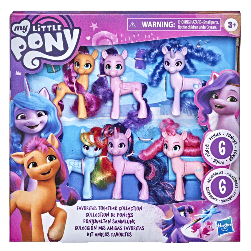 Pakkauksessa yhteensä 6 kpl 7,60 cm ponihahmoja, joista kolme on uudesta My Little Pony elokuvasta ja kolme vanhoja hahmoja Friendship is Magic -sarjasta. Jokaisella pohihahmolla on mukana tarvike.