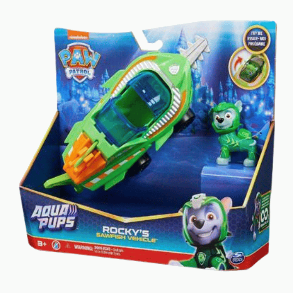 Päällään Rekulla on hänen vihreä Aqua pennut märkäpukunsa ja kypäränsä, hän on valmis superpelastuksiin leikkimerellä! Rekun Sahakala-ajoneuvossa on jännittävä muodonmuutos!