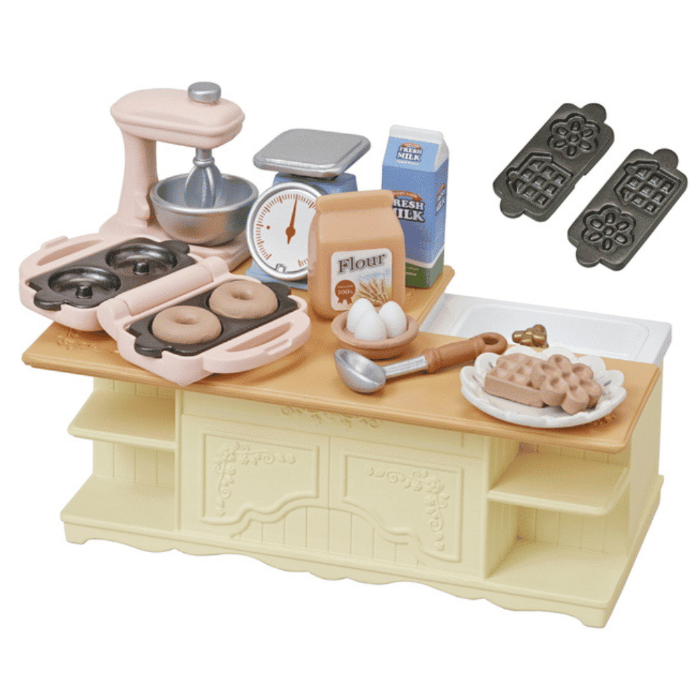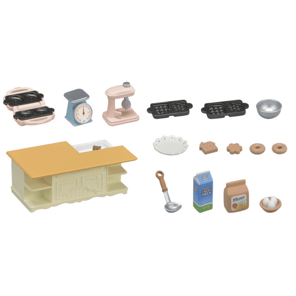 Sylvanian Families keittiösaareke on jokaisen leikkitalon kohokohta. Siihen kuuluu n. 11 cm korkea saareke työtasoineen, useita säilytyshyllyjä sekä tiskiallas. Ainekset punnitaan ensin keittiövaa’alla, sitten ne sekoitetaan yleiskoneella herkulliseksi taikinaksi.