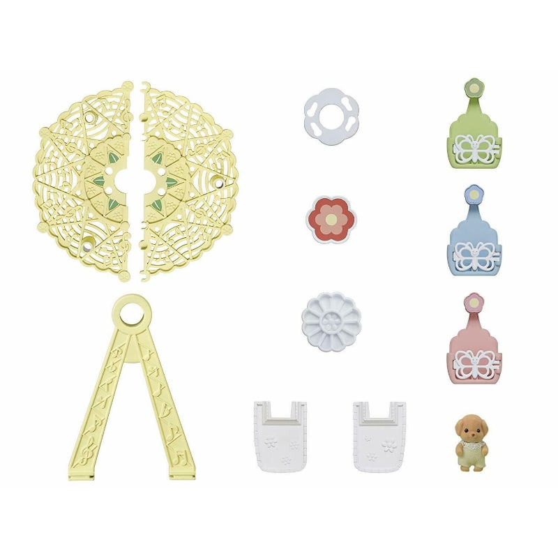 Sylvanian Families-vauvojen seikkailumaailmanpyörästä suloiset eläinhahmot näkevät koko Sylvanian kylän. Jokaiseen kolmeen koriin mahtuu vauvahahmo, joka pääsee nousemaan kyytiin tai kyydistä pois helposti pienen oven kautta. Maailmanpyörää voi pyörittää takasivulla sijaitsevasta pyörästä kääntämällä, jolloin pienokaiset pääsevät ylös korkeuksiin ja näkevät kylänsä. Settiin sisältyy maailmanpyörä ja kolme gondolia sekä villakoiravauva. Koko: (LxKxS): 17 x 22 x 5 cm. Hahmo koko on noin: 4,5 cm. Ikäsuositus: 3+ vuotta.