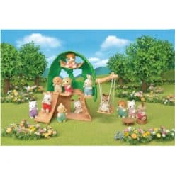 Sisältää seikkailupuumajan, liukumäen, keinun, pienen pöydän ja jakkaran sekä pähkinäoravavauvan.