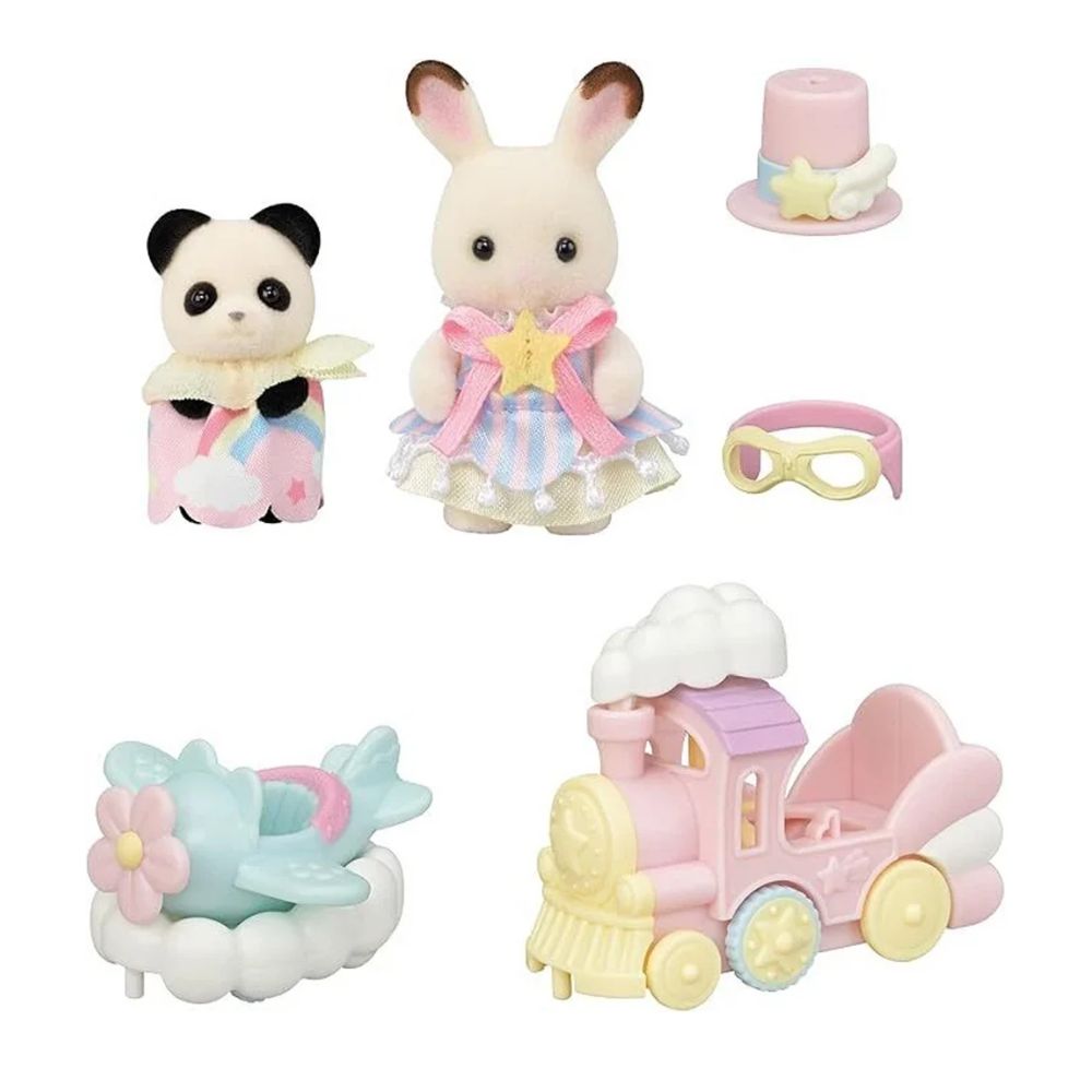 Sylvanian Families huvipuistosetti, jossa on hurmaava höyryjuna ja lentokone! Tämä ihastuttava setti sisältää Creme nimisen jänis vauvan ja Erin nimisen panda vauvan.