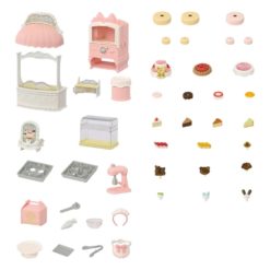 Tässä kakkukauppa setissä on uuni, jossa voi leipoa kakkupohjia. Lisäksi on erilaisia kakun koristeita. Kun kakkupohjat ovat valmiita, koristele ne kermalla ja täytteillä ja tee erilaisia kakkuja. Koristeita on yli 100 erilaista yhdistelmää! Järjestä kakut vitriiniin ja esittelypöydälle. Kakut voidaan poimia pihdeillä ja laittaa laatikkoon, jotta asiakkaat voivat viedä ne kotiin.