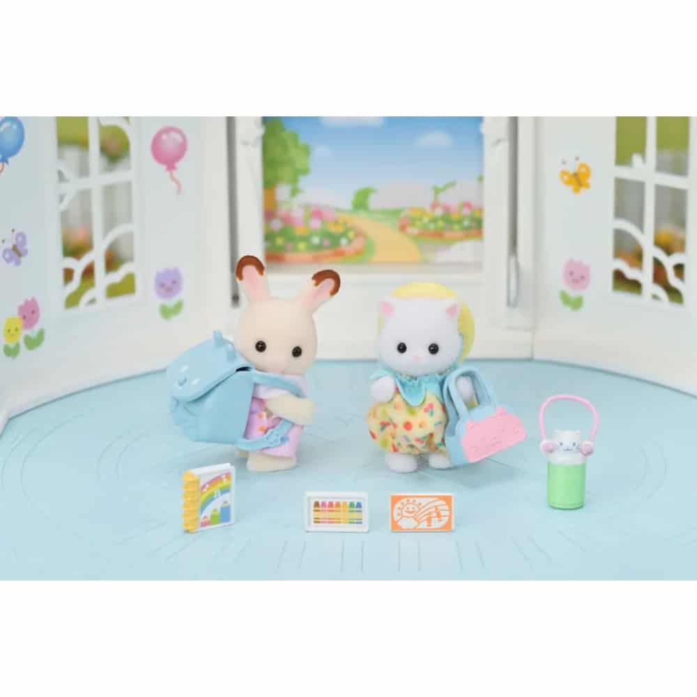 Setissä on kaksi vauvaa ja tarvikkeet kävelyretkelle: reppu,vesipullo, kangaskassi, hattu ja piirustusvälineet. Vauvat voivat käyttää hattua ja piirustusvälineet mahtuvat kassiin. Yhdistä muihin Sylvanian leluihin.