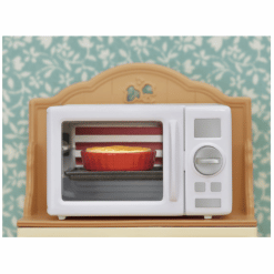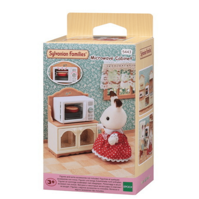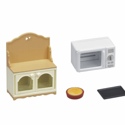Sylvanian Families kaappi ja mikroaaltouuni -setin mikroaaltouunissa leivotaan herkullisia kakkuja. Käännettäessä kytkintä mikroaaltouuni muuttuu punaiseksi. Mikroaaltouuni sijaitsee keittiökaapissa, jossa on kaksi ovea, ja jossa voi säilyttää muita keittiötarvikkeita.
