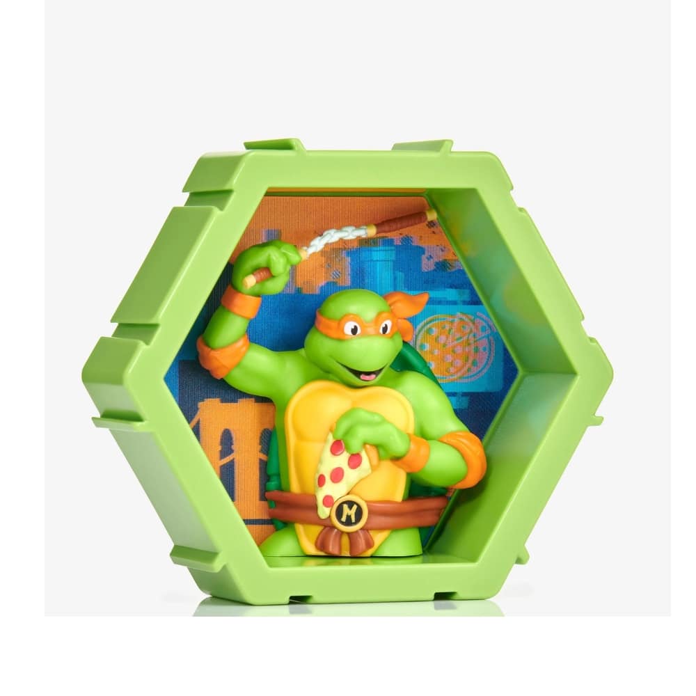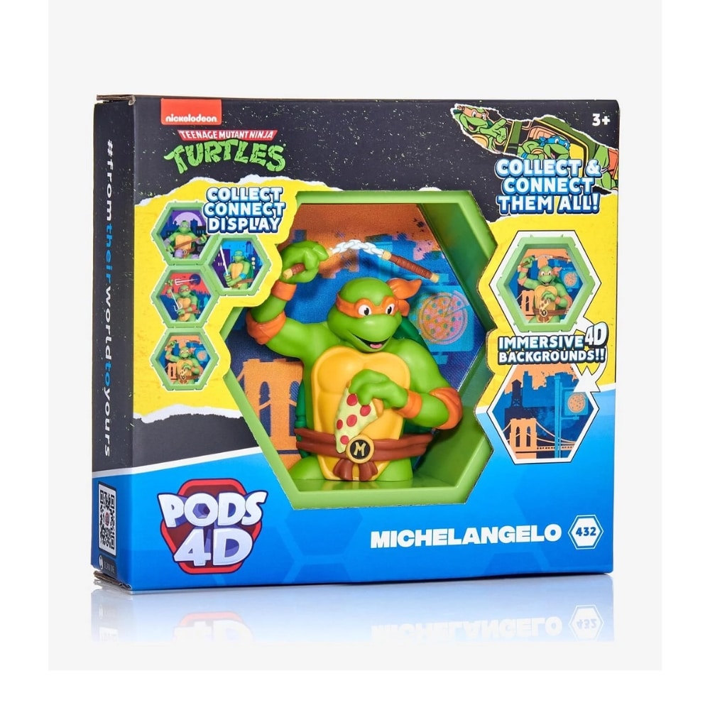 TMNT Michelangelo on ainutlaatuinen keräilyfiguuri, joka tulee ulos omasta maailmastaan ja astuu sinun maailmaasi! Maisematausta näyttää ponnahtavan Michelangelon maailmasta suoraan sinun maailmaasi upealla 4D-efektillä ja korkealla resoluutiolla. Kerää kaikki Teenage Mutant Ninja Turtles hahmo -kapselit ja liitä ne yhteen. Kapseleita voi yhdistää monin tavoin, jotta voit luoda oman ainutlaatuisen kokoelman seinällesi, hyllyllesi tai pöydällesi.