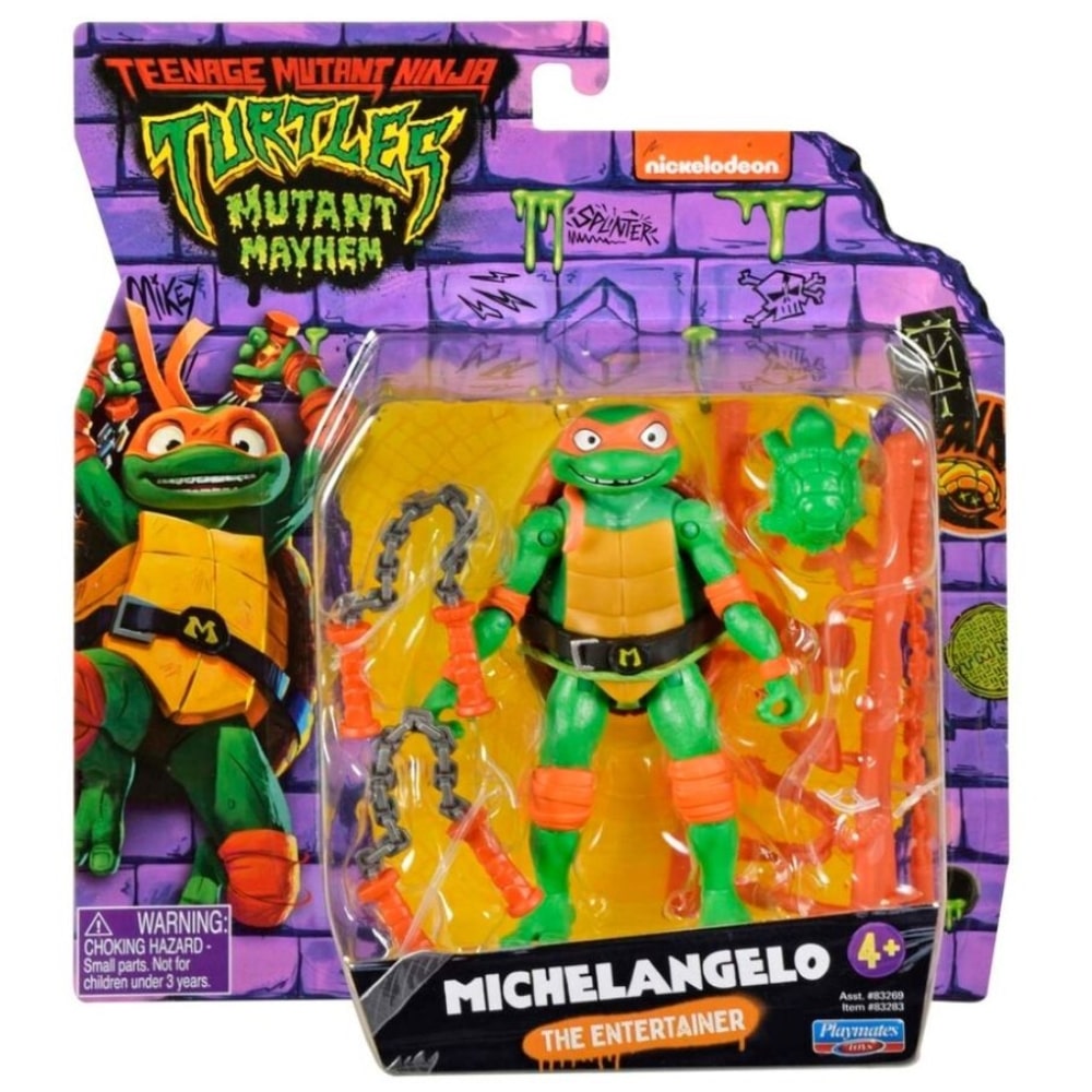 Valmistaudu Mutant Mayhem turtles hahmo Michelangelo, joka perustuvat uuteen CG-animaatioon Teenage Mutant Ninja Turtles -elokuvaan! Napauta… napauta… ”Onko tämä asia päällä?” Mikey on ryhmän hauska, tai ainakin hän luulee niin! Rotta-isänsä Splinterin koulutuksen ansiosta Michelangelo ja hänen veljensä ovat vihdoin valmiita lähtemään suurkaupunkiin, jossa Mikey voi testata materiaaliaan. Mikään ei tule hänen ja hänen unelmansa olla stand up -koomikko väliin, vaikka ainoa positiivinen palaute, jonka hän saa, tulee mikrofonista! Michelangelo-hahmo on 11,4 cm pitkä ja suunniteltu vastaamaan hänen elokuvahahmoaan. Setti sisältää hänen ikonisen nunchakun ja tulee ainutlaatuisessa Mutant Mayhem -paketissa!