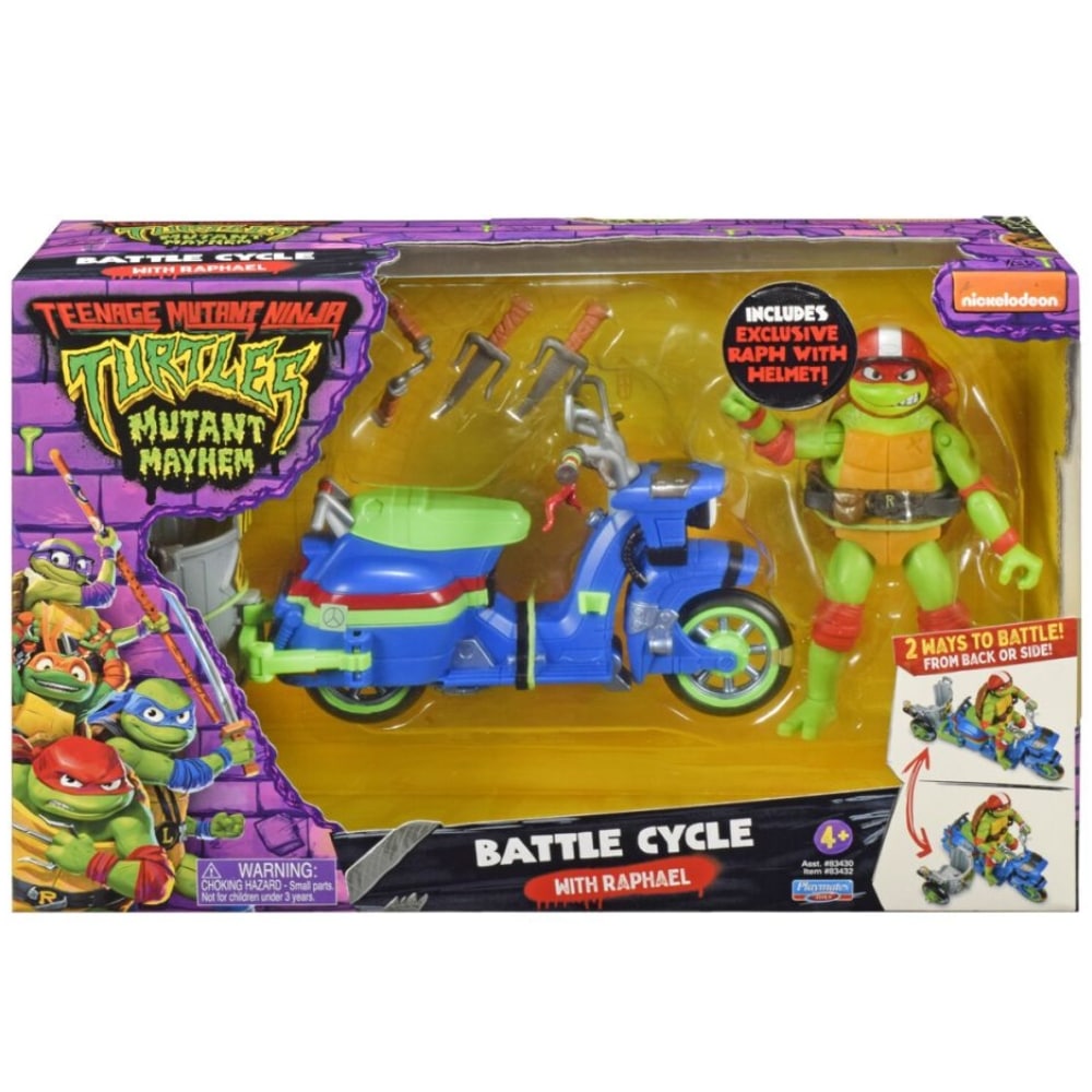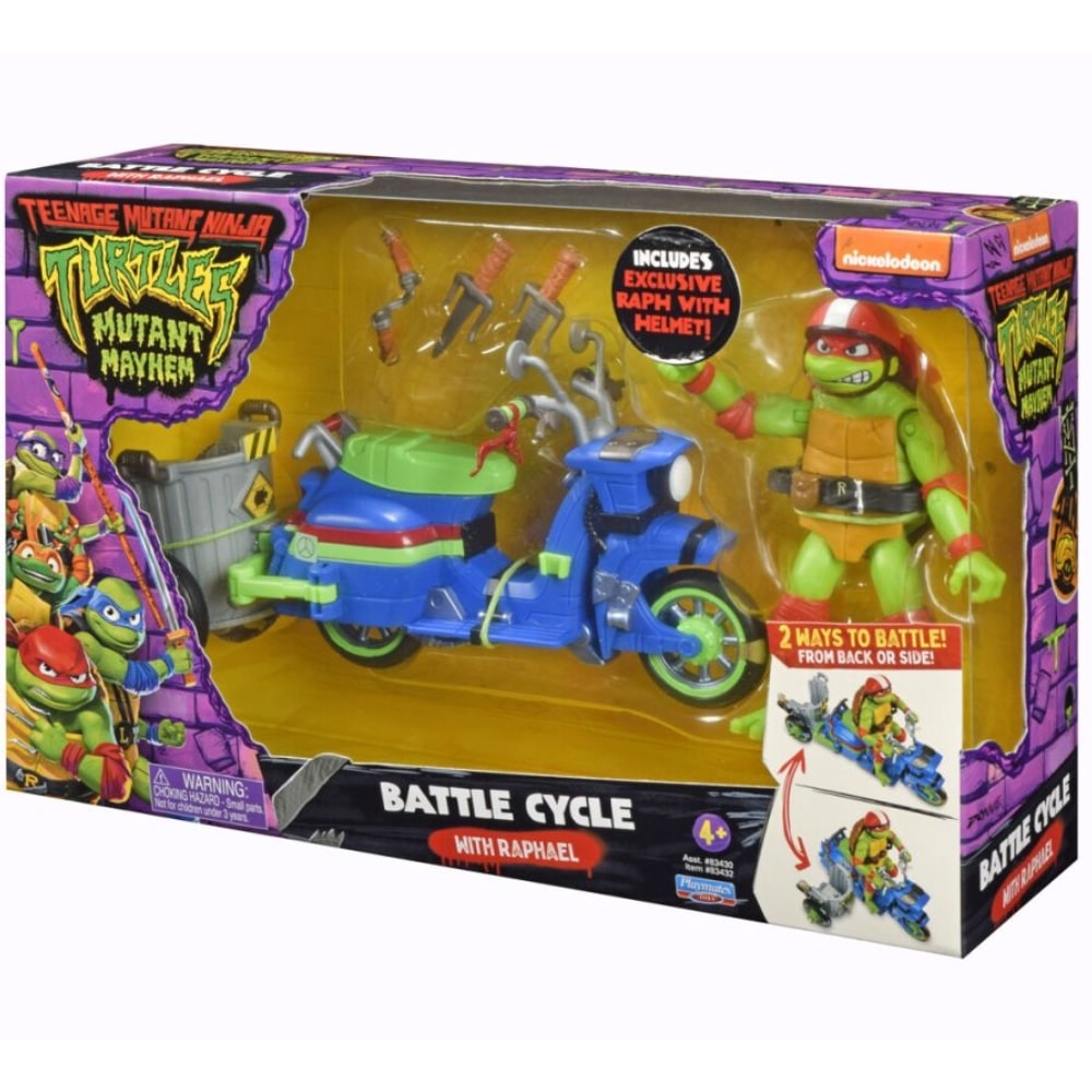 Valmistaudu Mutant Mayhem Turtles Skootteri ja Raphael, jotka perustuvat uuteen CG-animaatioon Teenage Mutant Ninja Turtles -elokuvaan! Kun yksi kilpikonna ei riitä käsittelemään Super Flyä ja hänen kätyrinsä pahiksia, kilpikonnat kutsuvat Raphia ja yhtä hänen veljestään ryhtymään toimiin ja hoitamaan ongelmia! He ovat ottavat ystävänsä Aprilin skootterin ja muuntaneet sen Battle Cycleksi, jossa on muuttuva sivuvaunu, jotta kuka tahansa neljästä veljestä voi ajaa mukana ja taistella! Sivuvaunu voidaan sijoittaa taakse tai sivulle riippuen siitä, millainen taistelutoiminta voittaa pahikset! Setti sisältää eksklusiivisen 11,50 cm Raphael-figuurin ikonineen kaksosai-aseineen.