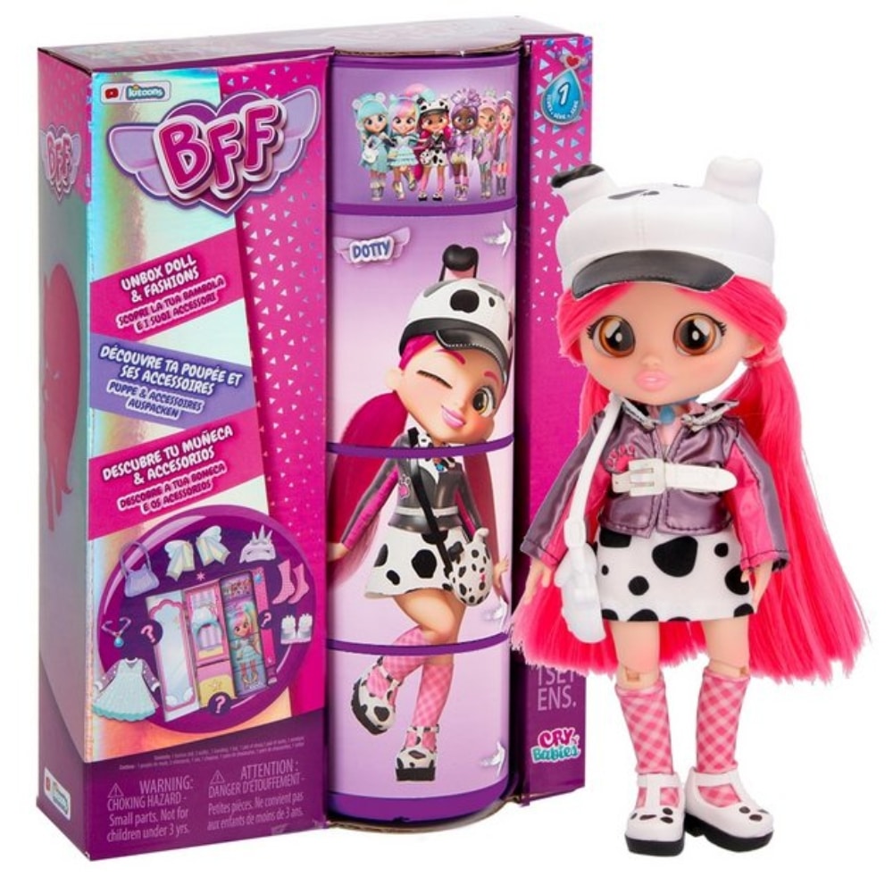 BFF-nukke Dotty Cry Babies – BFF-nuket ovat koulua käyviä bestiksiä, jotka seikkailevat yhdessä. Nukella on upean pitkät hiukset, trendikkäät vaatteet ja asuun sopivat asusteet. Jokaisella bestiksellä on oma kyynelkaulakoru. Koko: noin 20 cm. Useita erilaisia, jotka myydään erikseen. Kerää kaikki kuusi erilaista nukkea! Ikäsuositus: 3+ vuotta.