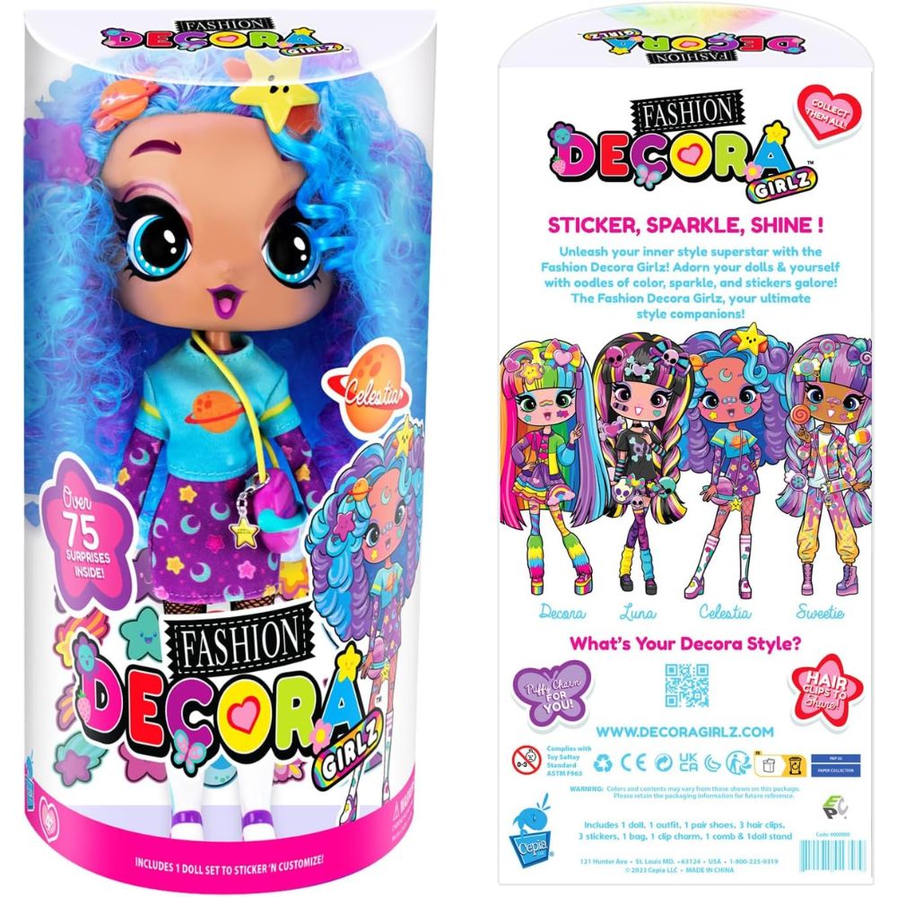 Decora Girlz -nuket ovat ihanan värikkäitä, ja niitä voi itse koristella paketissa tulevien tarrojen ja asusteiden avulla. Pakkauksessa on Decora Girlz Celestia-nukke vaatteineen, erilaisia asusteita ja tarvikkeita, tarroja koristeluun sekä hiuspinnejä, joita voi käyttää myös itse.