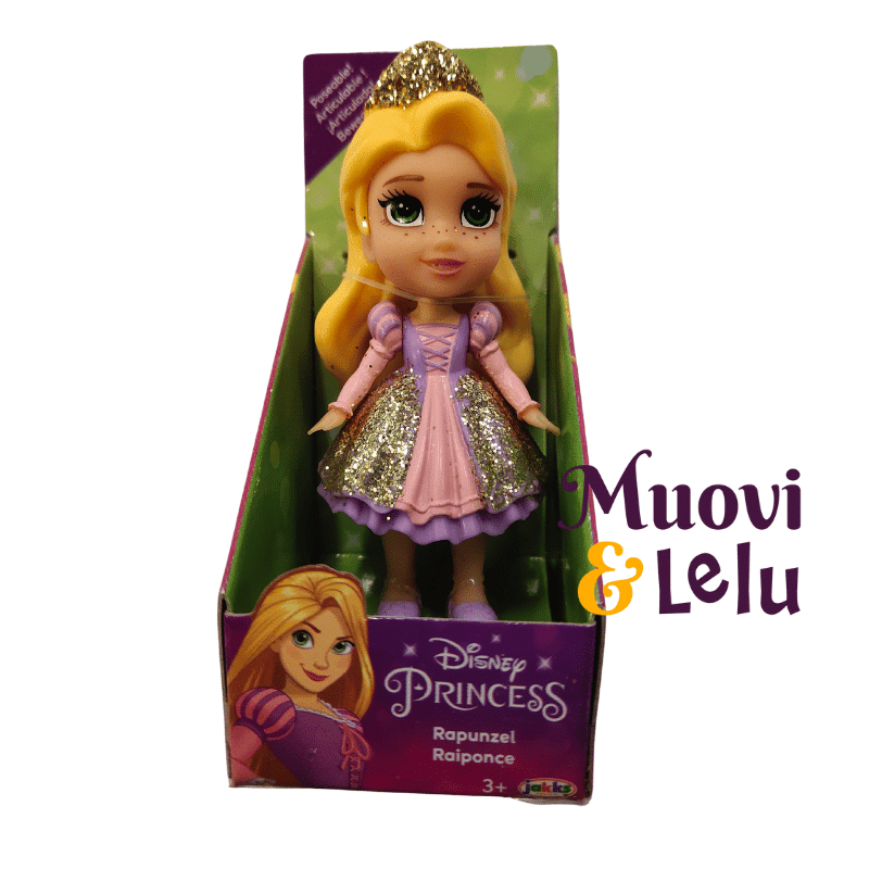 Pieni Disney prinsessa Rapunzel-hahmo on pukeutunut upeaan glitteriseen mekkoon.