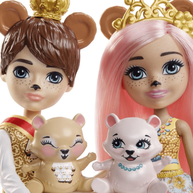 Braylee Bear ja Bannon Bear ovat pukeutuneet parhaimpiinsa ja valmiina lähtemään kuninkaallisiin juhliin. Sinutkin on kutsuttu! Enchantimals leikkisettiin kuuluu kaksi nukkea ja lemmikkiä, kaksi kruunua, olkanauha ja kaksi lahjapakettia.