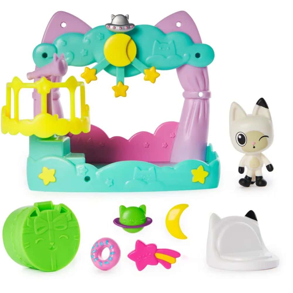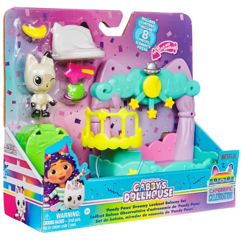 Astu Gabbyn Nukketalon maagiseen maailmaan Pandi Pörrön Unelma -parvekeleikkisarjan avulla. Sisältää 6,3-senttisen Pandi Pörrö -leluhahmon, nukketalon kalusteita ja 6 nukketalotarviketta, mukaan lukien kaukoputken ja parvekeriipukset. Ripusta parveke nukkekodin ikkunoista ja avaa sitten nukketalopaketti, jotta voit paljastaa yllätyslelun – donitsikorun. Skannaa QR-koodi nukketalopaketista saadaksesi erikoispalkinnon ilmaisessa Gabbyn Nukketalo -sovelluksessa, joka on saatavilla iOS- ja Android-käyttöjärjestelmille.