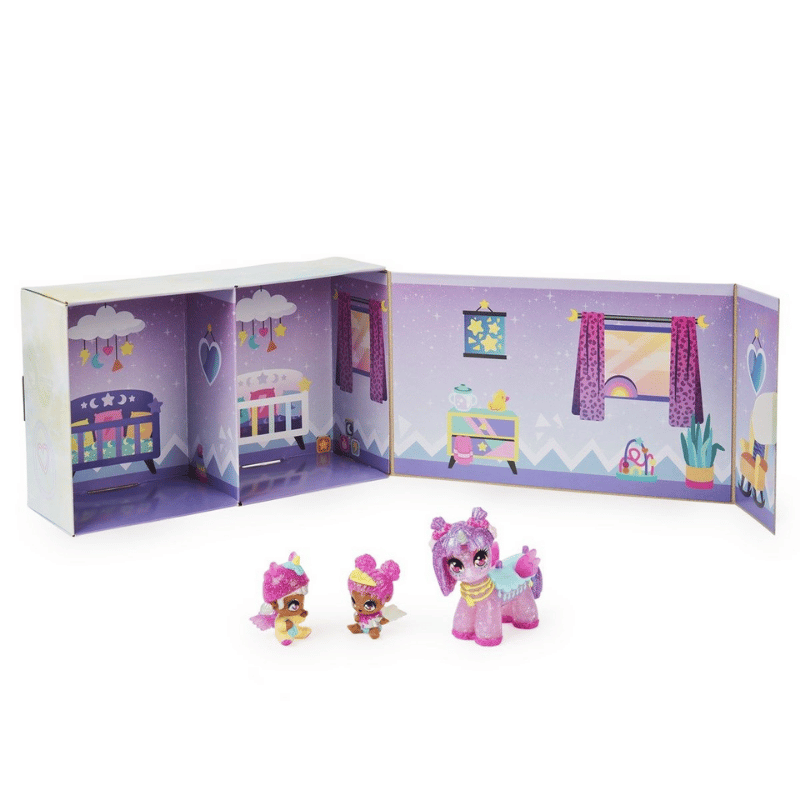 Hatchimals Pixies Shimmer Baby Ridersit ovat söpöimät kaksoset! Erittäin suloisilla Shimmer Babies keiju kaksosilla on kimaltavia yksityiskohtia, siivet ja artikuloitu pää. Keijujen mukana tulee eläin jolla he voivat ratsastaa. Pakkauksen avaaminen on maaginen kokemus. Poista siivet munan päältä, hiero lämpöä sydän kuvioon ja riko muna auki. Löydät sisältä kaksoskeijut sekä 4 tarviketta, kuten tutit, eläin ja koriste. Liu’uta laatikko ulos pahvista, ja löydät lastenhuoneen kaksosillesi. Kiinnitä siivet takaisin tuttipullon muotoiseen munaan ja saat pinnasängyn joka oikeasti keinuu. Kun olet lopettanut leikin, voit sulkea lastenhuoneen ja säilyttää kaikki hahmosi siellä. Kaksosia on kaksi erilaista, kerää ne molemmat!