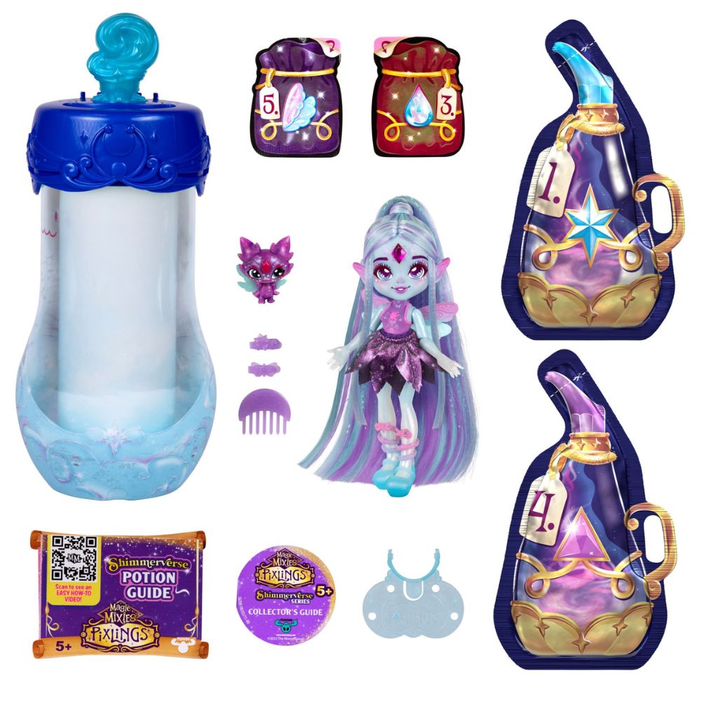Sekoita maagiset kimalleaineet ja paljasta kaunis Pixling-nukke Flyt the Dragonfly pimeässä hohtavilla hiuksilla. Mukana on myös hänen Mini Mixie-ystävänsä.