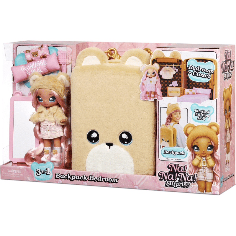 Na! Na! Na! 3-in-1 pitää sisällään upeita yllätyksiä. Samasta leikkisetistä löydät muotinuken, söpön repun ja upean makuuhuoneen/vaatehuoneen! Jokaisella nukella on omanlaisensa tyyli, joka on saanut inspiraationsa hänen lempieläimestään. Sarah Snugglesin lempieläin on nallekarhu, Niinpä löydät hänen yltään teemaan sopivia asusteita. Hänen lempiasusteensa on upea hattu, jossa on karhun korvat ja pörröinen takki. Sarah Snugglesilla on pitkät, vaaleanpunaiset hiukset, joita voi harjata mukana tulevalla harjalla. Pakkaa kaikki leikkitarvikkeesi mukana tulevaan reppuun, niin voit leikkiä missä vain! Avatessasi repun, löydät upean makuuhuoneen/vaatehuoneen, jonne voit ripustaa nuken vaatteet roikkumaan. Mukana lisäksi peili, kokoontaitettava sänky, vaatekaappi, laatikot, tyynyjä ja viltti.