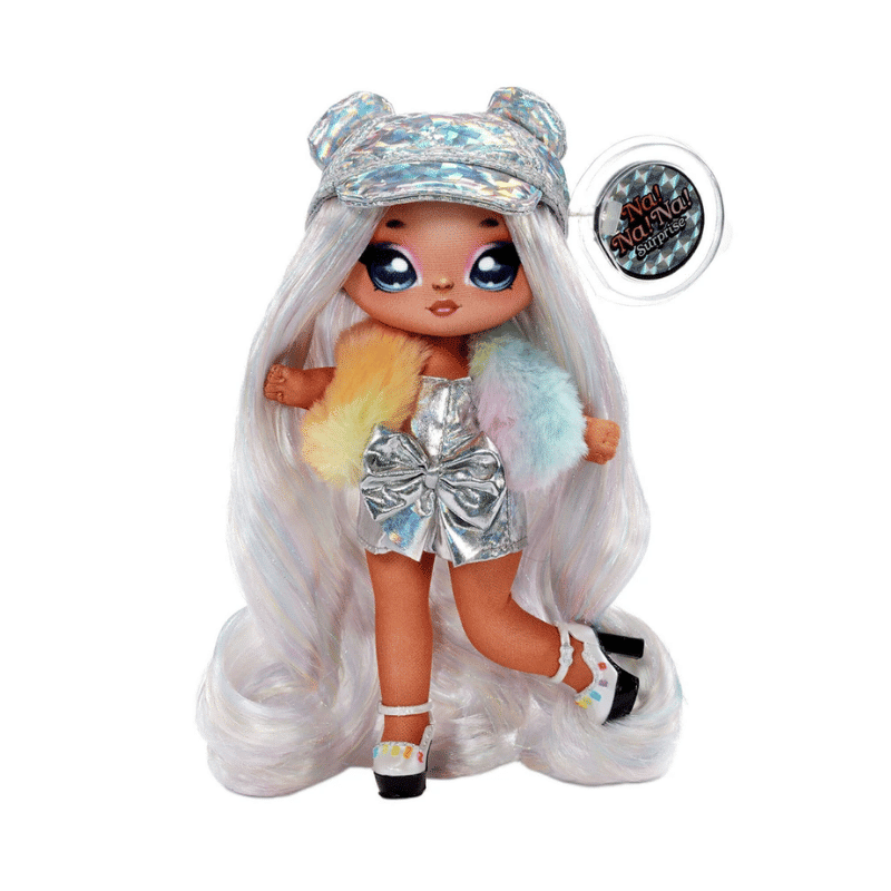 Na!Na!Na! Metallic -yllätysnuket hohtavat nyt kiiltäväpintaisissa asuissa! Hienoilla yksityiskohdilla koristellut nuket ovat pukeutuneet tyylikkäisiin vaatteisiin, jotka ovat saaneet inspiraation suloisista eläimistä. Ari Prismin tyyli on täynnä hehkua, niinpä hänen tyyliään koristaa upeat hiukset, säihkyvä mekko, sekä pörröinen liivi. Mukana saat ihanan kiiltäväpintaisen pehmokukkaron, jota koristaa suloinen eläinhahmo. Kukkarossa on kätevä klipsikiinnitys, jonka avulla sen saa halutessaan reppuun kiinni. Nukke on n. 19 cm.