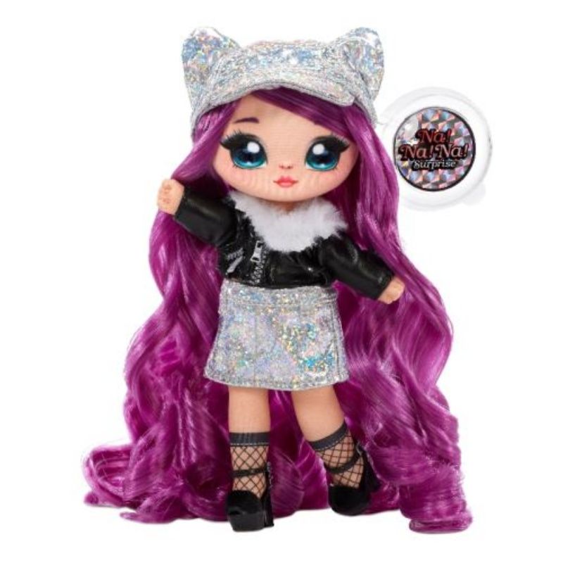 Na!Na!Na! Metallic -yllätysnuket hohtavat nyt kiiltäväpintaisissa asuissa! Hienoilla yksityiskohdilla koristellut nuket ovat pukeutuneet tyylikkäisiin vaatteisiin, jotka ovat saanet inspiraation suloisista eläimistä. Chrissy Diamondin tyyli on täynnä hehkua, niinpä hänen tyyliään koristaa upeat liilat hiukset, säihkyvä mekko, sekä tyylikäs takki. Mukana saat ihanan kiiltäväpintaisen pehmokukkaron, jota koristaa suloinen eläinhahmo. Kukkarossa on kätevä klipsikiinnitys, jonka avulla sen saa halutessaan reppuun kiinni. Nukke on n. 19 cm.