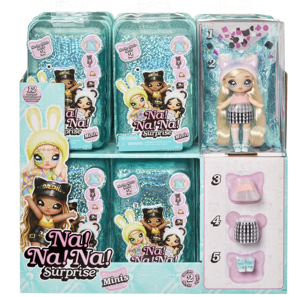 Kerää suosikki alkuperäinen Na! Na! Na! Surprise mini yllätysnukke! Pienet yllätysnuket ovat sarjasta kaksi. Minkä yllätysnuken sinä saat? Jokaisen pakkauksen mukana tulee yksi eläinaiheinen nukke, jolla on upeat hiukset ja isot silmät sekä nukelle tarkoitetut kengät ja vaatteet. Pakkaus saattaa sisältää lisäksi yhden parin sukkia. Yllätysnukke soveltuu neljä vuotiaille ja sitä vanhemmille lapsille.
