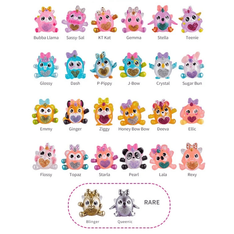 Rainbocorns-yllätykset ihastuttavat kaikissa sateenkaaren väreissä. Pienen munan sisältä paljastuu soma pikkufiguuri, siivet, sydänkoru, sormus ja hiuspinni. Pakkaus sisältää neljä Itzy Glitzy -munaa. Hahmoja on 26 erilaista, kerää ne kaikki!