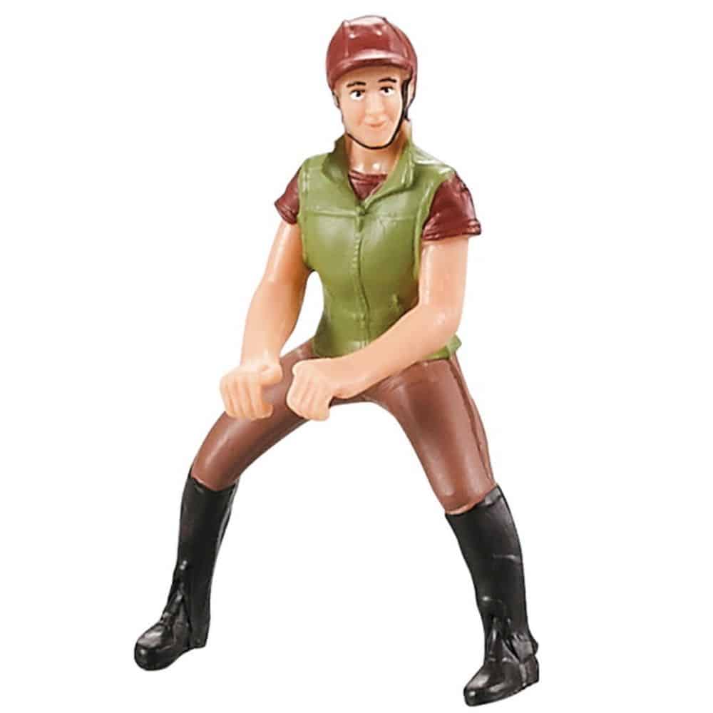 Ratsastaja pienille leikkihevosille. Tyttö, asusteena vaalean vihreä liivi, ruskeat housut.