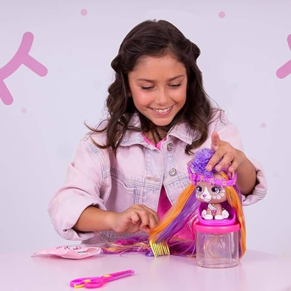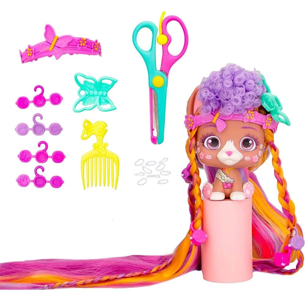 VIP Pets -hahmoilla on entistä upeammat ja paksummat hiukset! Leikkaa hiuksista hiuslisäkkeitä mukana tulevien tarvikkeiden avulla ja loihdi persoonallisia kampauksia!