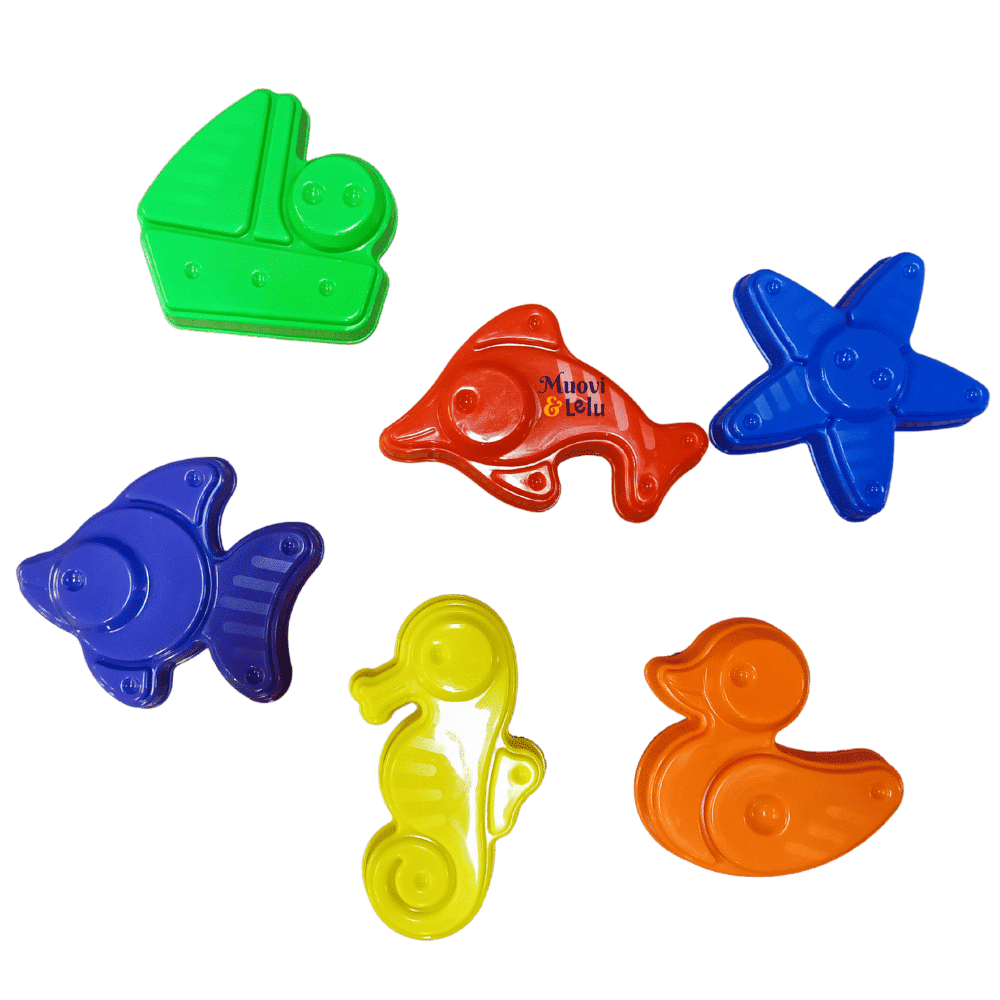 Hiekkamuotit 6 kpl Plasto, jossa on kuusi hauskaa eri muotoista hiekkamuottia. Pakattu verkkopakkaukseen.