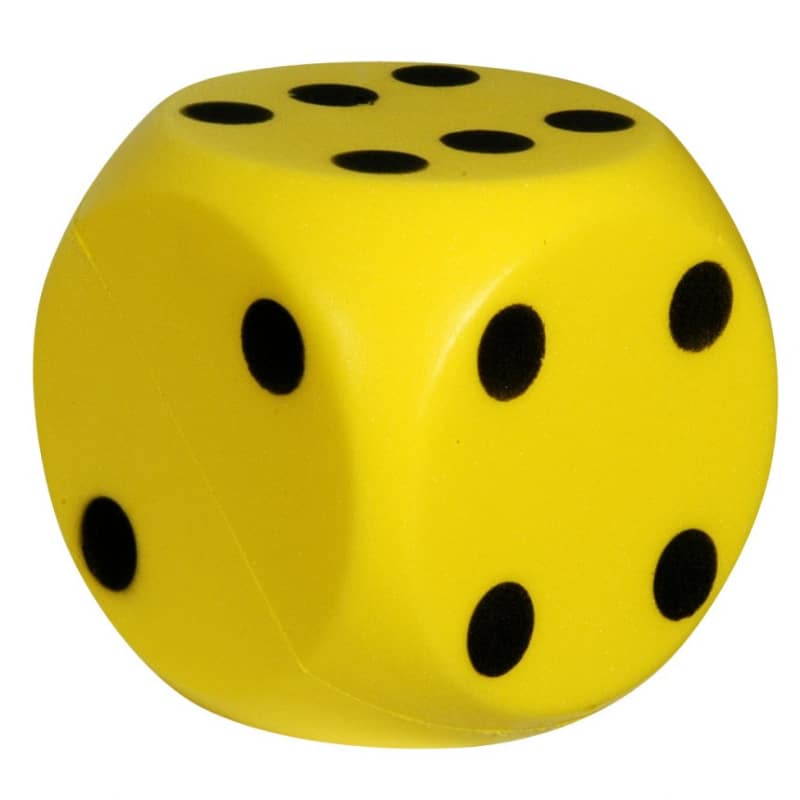Pehmeä iso solumuovinen arpakuutionoppa soveltuu pelaamiseen tai leikkimiseen. Lajitelmassa on kaksi eri väristä: keltainen ja punainen.