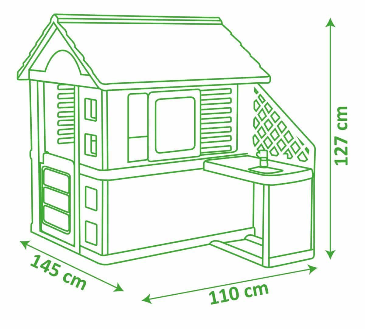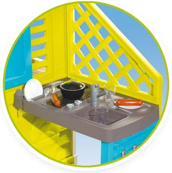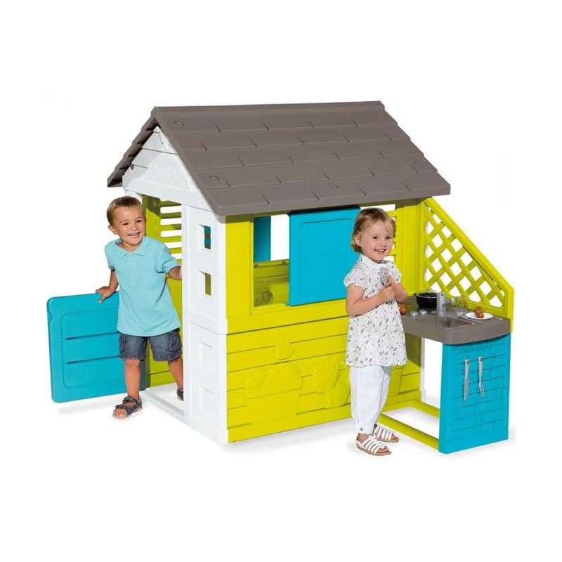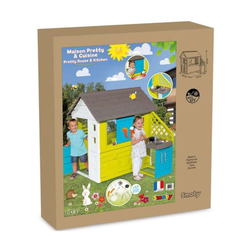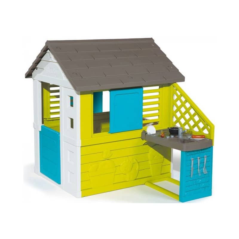 Leikkimökki + keittiö Smoby on Hauska ja jämäkkä Smoby leikkimökki, joka sopii pienellekin pihalle. Tässä leikkimökissä on kaksi liuutettavaa ikkunaa ja edessä puoliovi. Mökin omasta kesäkeittiöstä löytyy liesi ja tiskiallas sekä tarvikkeita herkullisen aterian valmistamiseen. Mökin UV-käsittely takaa, että aurinko ei haalista värejä pitkässäkään käytössä. Sisältää kuvan tarvikkeet.