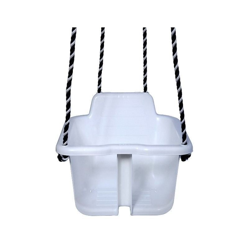 - Plaston muovinen valkoinen vauvakeinu turvallisella köydellä ja kätevällä rakenteella, jossa lapsen on mukana keinua. Keinun voi ripustaa joko keinutelineeseen tai puuhun.
