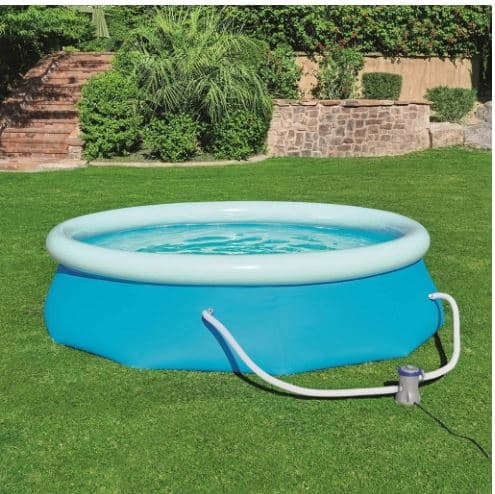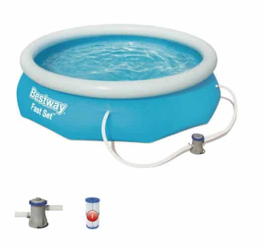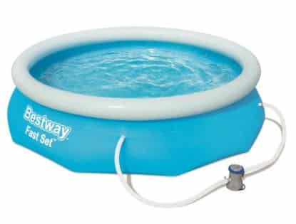 Nauti kesästä omalla uima-altaalla! Bestway valmistaa suosittuja uima-altaita. Tämä Bestway Fast Set maanpäällinen uima-allassetti on helppo asentaa: 1-2-3. Asennus kestää yleensä noin 10 minuuttia, kun asennuksessa on mukana 2-3 henkilöä. Aikaan ei lueta mukaan uima-altaan sijoituspaikan maan käsittelyä ja altaan täyttämistä. Pakkaus sisältää yhden uima-altaan, suodatinpumpun sekä korjauspaikan.