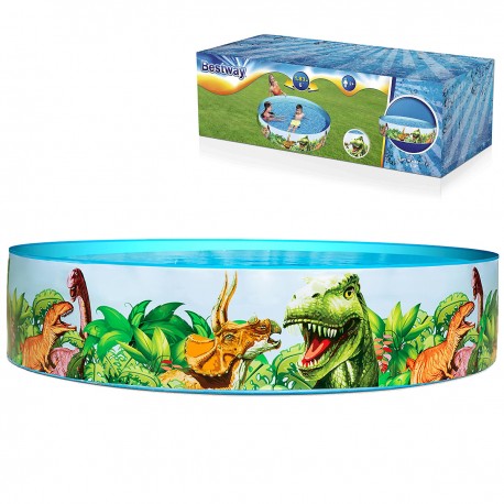 Kovareunainen täytettävä lastenallas, jonka reunoja koristavat dinosaurukset. Rulla-altaan reunat pysyvät pystyssä veden avulla. Vahva PVC-muovinen heavy-duty-reunuksessa on kiinni vinyylipohja.