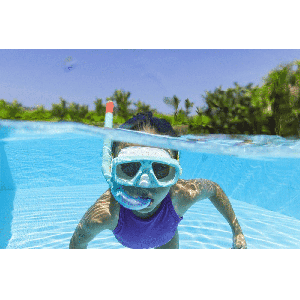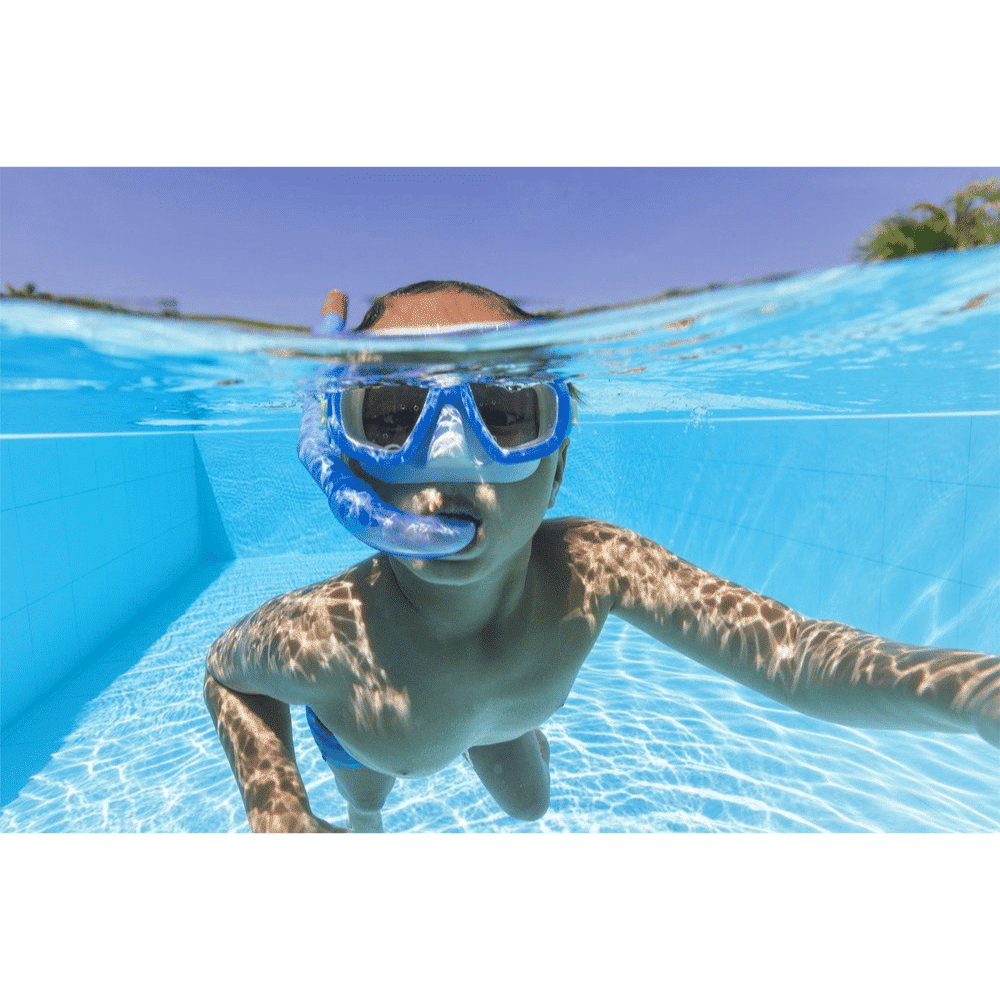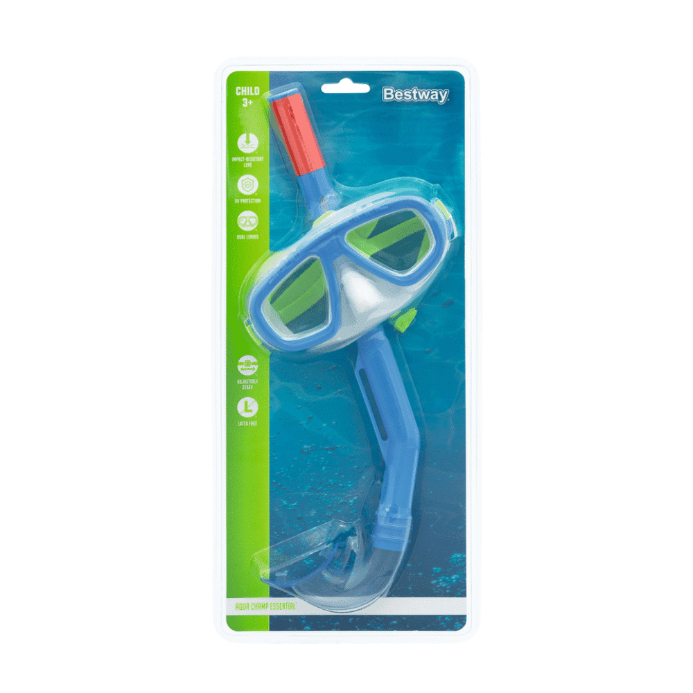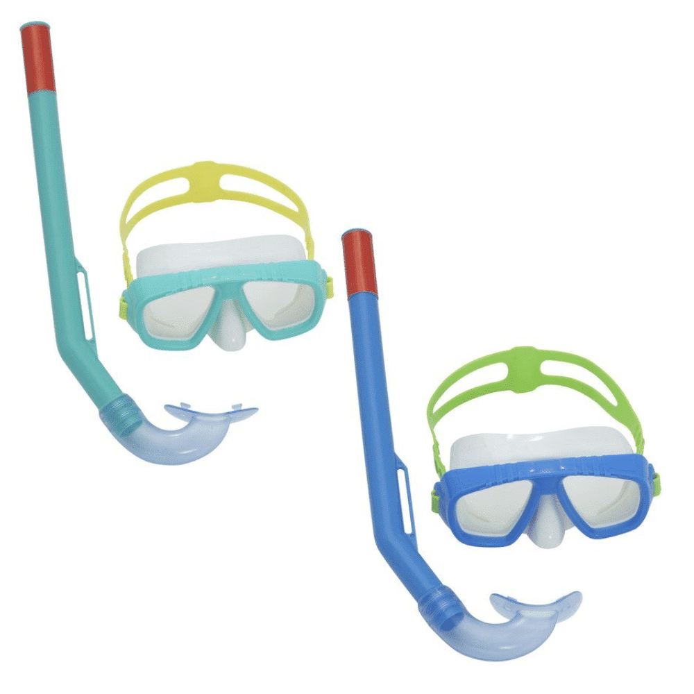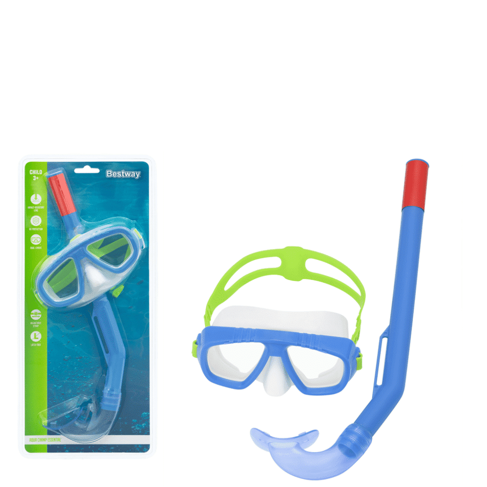 Snorkkelisetti Bestway erilaisia lajitelmassa on kaksi eri väristä snorkkelia. Snorkkeissa on UV-suojattu polykarbonaattilinssi, ne ovat lateksittomia ja niiden päähihnaa voi säätää sopivan kokoisiksi. Snorkkeleissa on mukava hyvin istuva ja pehmeä suuosa. Ikäsuositus: 3-6 vuotta.