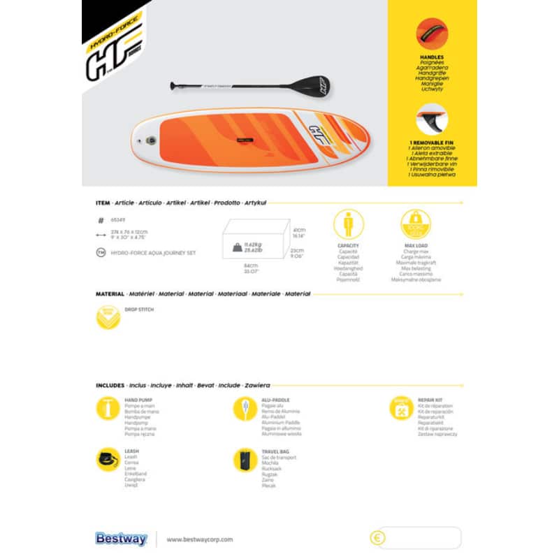 - Pakkaus sisältää sup-laudan, melan, käsipumpun, repun, nilkkaremmin, keskievän ja korjaussarjan.